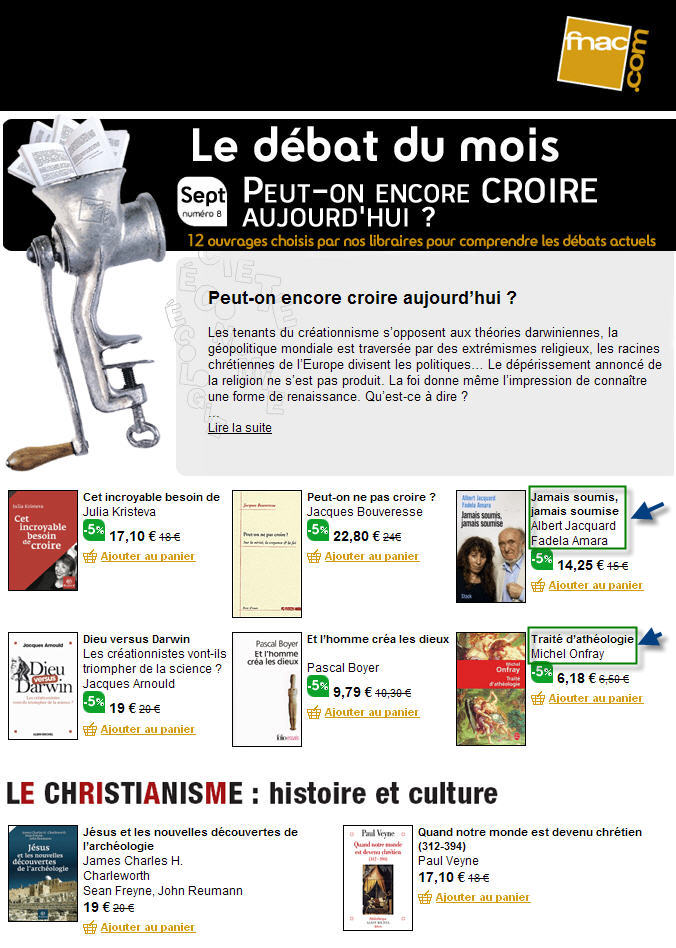 C'est le débat du mois, à la Fnac. Il est illustré et développé dans un dépliant, mi-publicité, mi-tract (dont l'image sur la première page me laisse perplexe), sous le haut patronnage de Monsieur Tincq. Drôle de débat, qui a attiré mon attention alors que je passais au magasin Fnac de ma ville, et y visitais le rayon "religion et spiritualités" (orthographe non garantie, je ne me souviens plus si c'est au pluriel), dont j'ai déjà parlé avec lassitude.