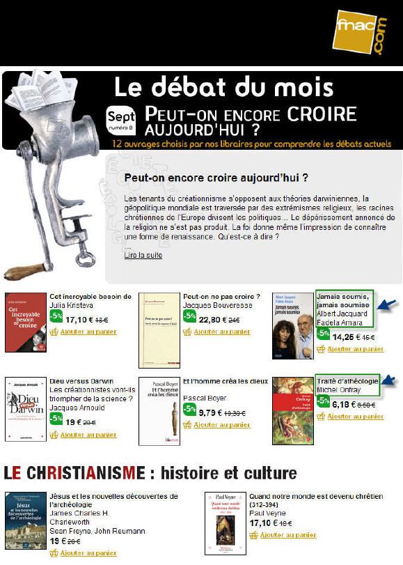 Il y a deux titres au moins dont la présence peut quand même surprendre dans une réflexion sur la religion. Ils y sont aussi incongrus qu'un livre du Saint-Père au rayon des guides touristiques (pourquoi pas? à la rubrique "Rome"...). Les auteurs en sont l'inénarrable Michel Onfray, et le tandem Fadela Amara (*) ("ni pute ni soumise"!!!) / Albert Jacquard (*).