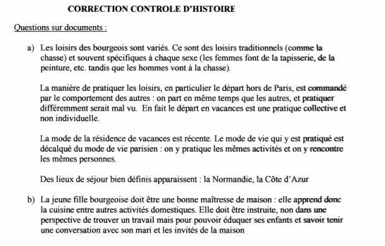 R C'est encore pire que cela. Une collègue enseignant l'anglais en Lettres Supérieures m'a dit que la plupart des élèves étaient incapables de situer chronologiquement le règne de Louis XV (c'est un exemple). Le document -anonyme- ci-dessous "traînait" à côté de la photocopieuse, dans un lycée "bourgeois" d'une ville de province. Il s'agit du corrigé d'un devoir donné à des élèves entre la seconde et la Terminale(?) Je n'ai pas l'énoncé du devoir en question, mais à lire le corrigé, ce ne devait pas être propre à faire chauffer les cellules grises des élèves. Le niveau linguistique, les concepts abordés, sont au niveau d'un CM2 tout au plus.