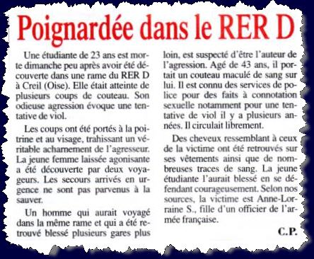 A lire également, le très bel article que lui consacre sur son blog Gérard Gachet. ---------------------- J'en éprouve beaucoup de peine, et je m'identifie très bien à ses parents, étant moi-même mère d'une jeune femme qui prend très souvent le RER pour se rendre à son travail. Black-out quasi total de la presse, y compris et surtout sur l'identité du monstre, jusqu'à ce que l'on apprenne furtivement, d'une part que le meurtrier est d'origine turque, puis que la pauvre jeune fille était originaire d'une famille catholique très croyante, ayant elle-même participé aux JMJ de Cologne.
