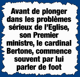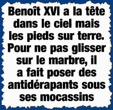 Pour les banalités, on y apprend par exemple qu"'après le petit-déjeuner, le Saint-Père se retire dans son vaste bureau, où sur la large table très bien rangée il y a juste quelques objets", puis que "l'après-midi, il fait un somme sur un large fauteuil avant d'endosser sa cape rouge et d'aller, pendant une petite heure se dégourdir les jambes dans les jardins du Vatican" (pas très pratique, une cape rouge d'apparât, pour se promener dans un jardin, elle devrait essayer!). N'oublions pas, car c'est d'un intérêt primordial, qu'il a fait poser des patins anti-dérapants à ses semelles de cuir! Tiens, moi aussi! Simplement pour éviter l'usure.