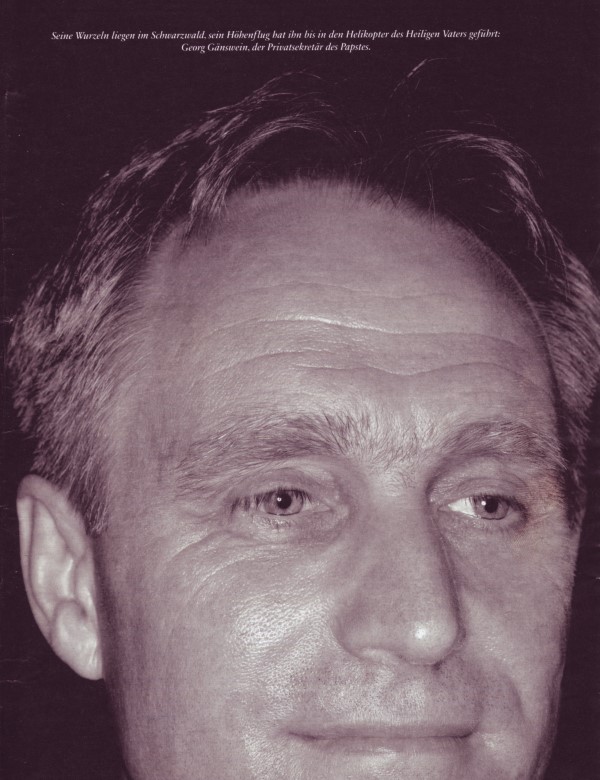 Le Docteur Georg Gänswein (l'usage en Allemagne veut que l'on fasse précéder le nom des gens de leur titre universitaire, ndr), un homme intellectuellement aiguisé, né le 30 juillet 1956 à Riedern, dans la Forêt Noire, l'aîné des cinq enfants d'un forgeron. A fait de "petits boulots" -moniteur de ski, facteur-. Etudiant en théologie, puis prêtre, vicaire. Promotion à Munich, vicaire de la cathédrale de Fribourg. Appelé à Rome en 1995, mutation à la Congrégation pour la Doctrine de la Foi, sous la direction du cardinal Ratzinger. Après l'élection comme Pape du cardinal Ratzinger en 2005, il devient secrétaire privé du Pape, avec la fonction d'organiser le travail du Pape, de façon à ce que celui-ci ne soit pas submergé par des flots de lettres, et les audiences. (Süddeutsche Zeitung)