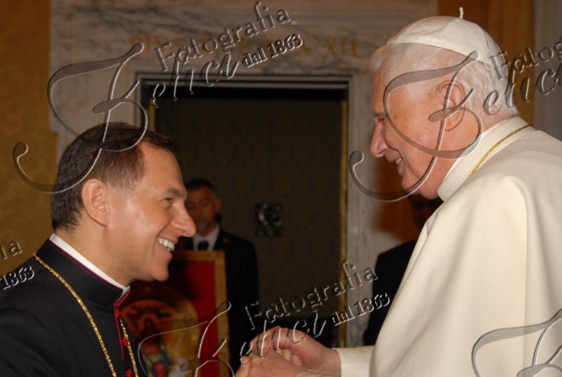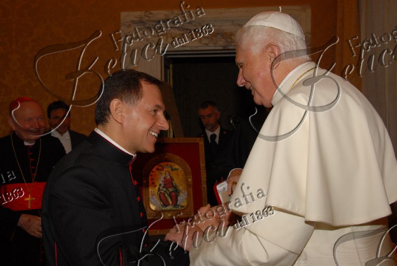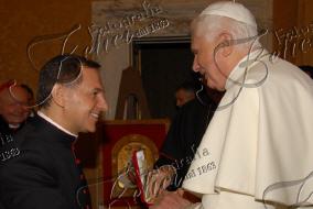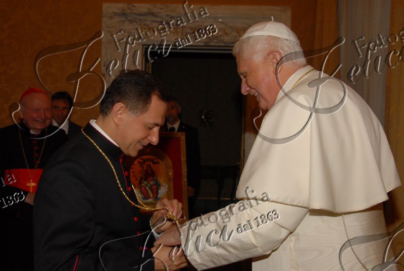 Mgr Mieczyslaw Mokrzycki, un polonnais, connu à Rome comme “Don Mietek”, a été l’assistant personnel de Jean-Paul II de 1996 à sa mort, le 2 avril 2005, et ensuite de Benoît XVI. ------------------- "Don Mietek", discret et compétent, que l'on aperçoit brièvement dans le reportage de la RAI "Il Papa dell'amicizia con Dio" a donc été récompensé de son dévouement en recevant des mains de Benoît XVI la croix épiscopale. Le 24 septembre, Le Saint-Père recevait les prélats de la Conférence épiscopale latine d'Ukraine, venus en visite Ad Limina, en présence de leurs confrères ukrainiens de rite byzantin. "Don Mietek" était parmi eux. Sheelagh a déniché pour moi sur le site de fotografia Felici ces images très émouvantes.