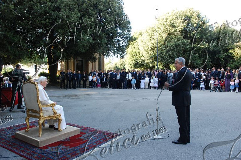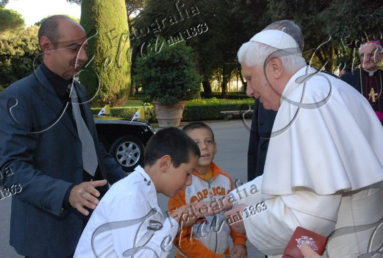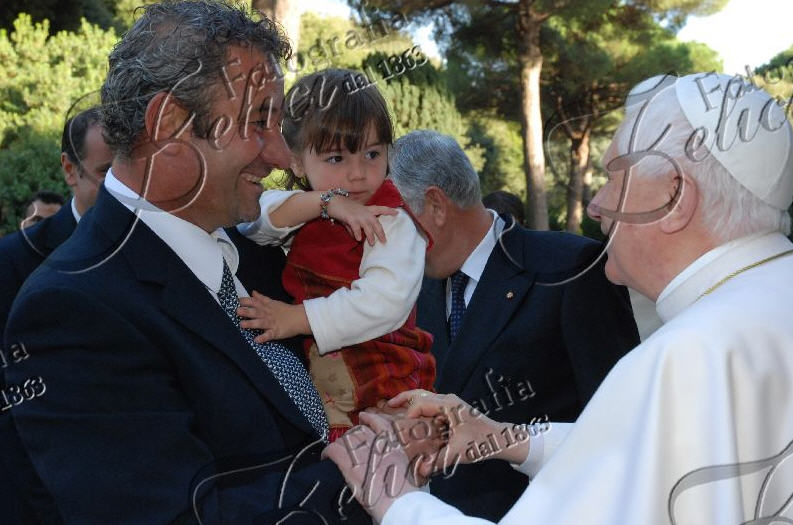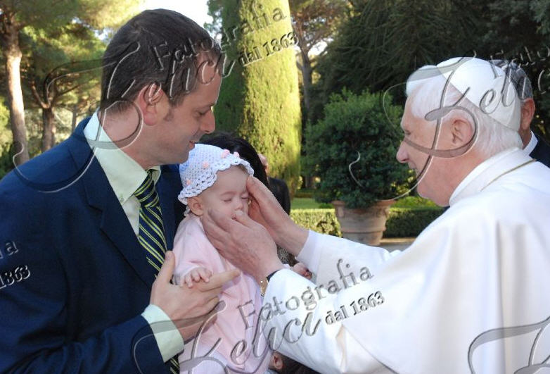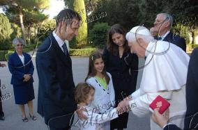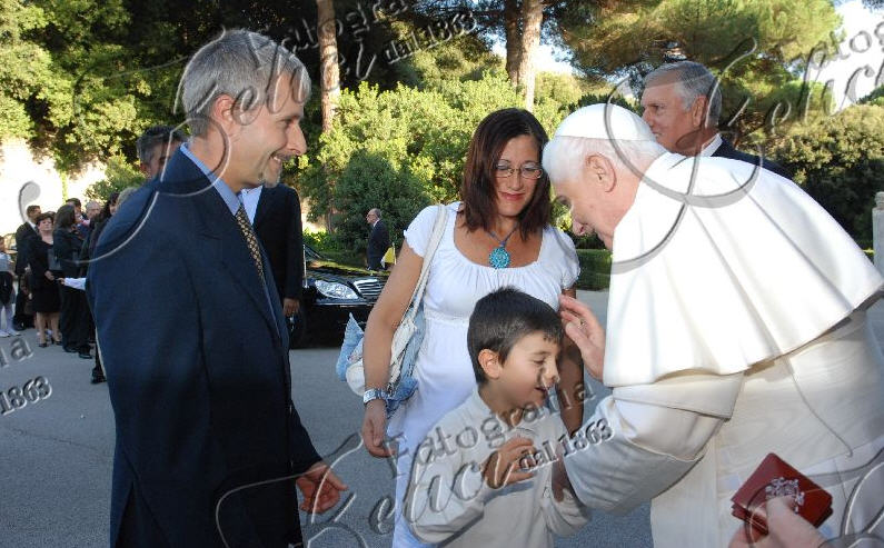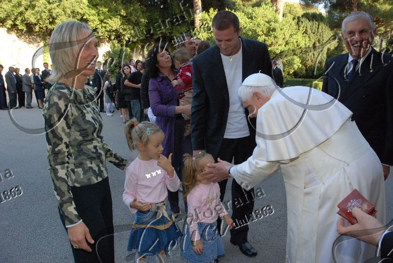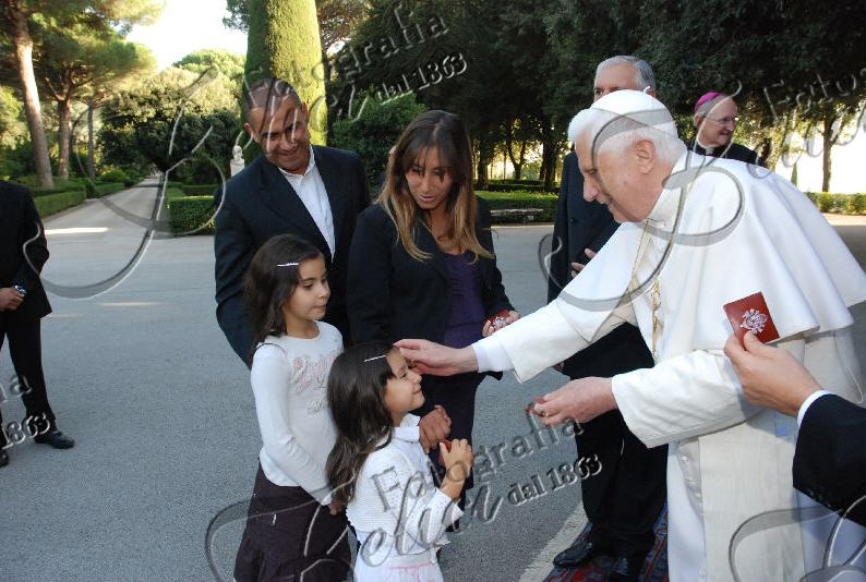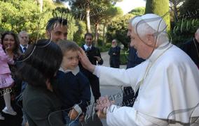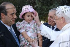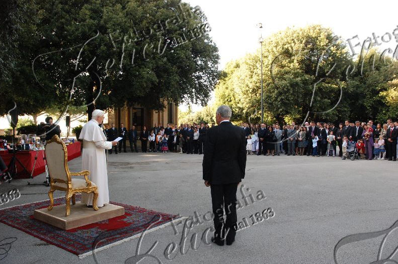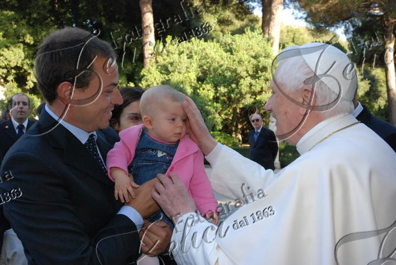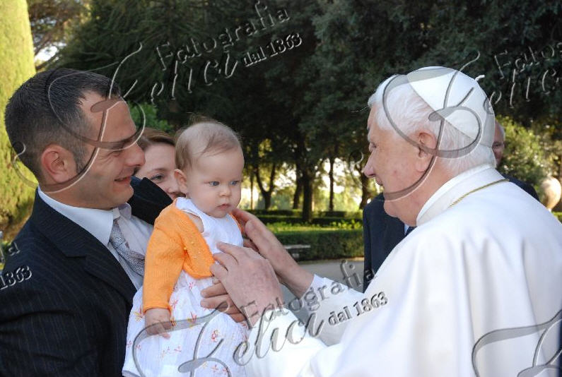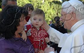 Le 1er octobre, avant de prendre congé de Castelgandolfo, le Saint-Père a rencontré dans les jardins du Palais Apostolique les employés des villas pontificales et leurs familles. Après les avoir remerciés pour leurs bons offices et leurs soins, il s'est exprimé "a braccio", se réjouissant avec une grande simplicité qu'il y ait tellement d'enfants... et les photos de Fotografia Felici (une fois de plus!) témoignent que son plaisir était justifié: ----------- "Je vous remercie encore pour tout, et je formule pour chacun de vous d'une vie heureuse et active. Avec ces sentiments, j'accorde de grand coeur à vous ici présents, ainsi qu'à vos familles - je suis heureux que tant de familles soient présentes, il y a tellement de bébés qui naissent ici!- la bénédiction apostolique, signe de ma constante bienveillance."