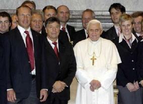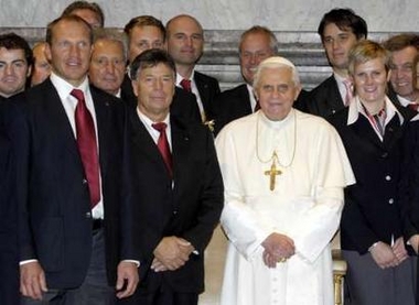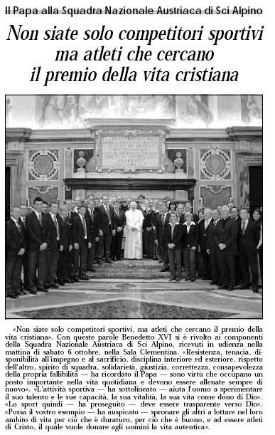Ne soyez pas seulement des compétiteurs sportifs, mais des athlètes qui cherchent le prix de la vie chrétienne... Résistence, ténacité, disponibilité au devoir et au sacrifice, discipline intérieure et extérieure, respect de l'autre, esprit d'équipe, solidarité, justice, correction, conscience de sa propre faiblesse sont des vertus qui occupent une place importante dans la vie quotidienne et doivent être rappelées toujours et à nouveau. L'activité sportive aide l'homme à expérimenter son talent et ses capacités, sa vitalité, sa vie comme don de Dieu. ... Le sport doit donc être transparent vers Dieu. Puisse votre exemple inciter les autres à lutter dans leur environnement pour ce qui est durable, pour ce qui est bon, et à être ds athlètes du Christ, lui qui veut donner aux hommes la vie authentique.