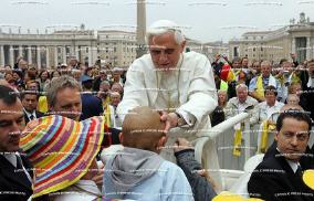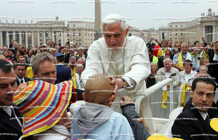 Les enfants atteints de tumeur fêtent Benoît De Luigi Accattoli Il Corriere della Sera ---------------------- Les enfants soignés à l'Institut des tumeurs de Milan sont sur la Place Saint-Pierre pour l'audience du pape, qui les salue: "chers petits amis" - et ils sautent et crient, joyeux pendant un moment. Mon coeur fond. Je me réjouis avec eux...