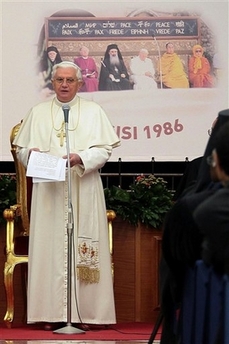 Respectant les différences entre les diverses religions, nous sommes tous appelés à oeuvrer pour la paix et à un engagement dynamique pour la promotion de la réconciliation entre les peuples. C'est l'authentique "esprit d'Assise", qui est opposé à toute forme de violence et d'abus de la religion comme d'un prétexte pour la violence. Face à un monde déchiré par les conflits, où la violence est parfois justifiée au nom de Dieu, il est important de réaffirmer que les religions ne doivent jamais devenir véhicules de la haine; ce n'est jamais en invoquant le nom de Dieu, que le mal et la violence peuvent être justifiés. Au contraire, les religions peuvent et doivent offrir de précieuses ressources pour la construction de la paix l'humanité, parce qu'elles parlent de paix au cœur même de l'être humain. L'église catholique a l'intention de poursuivre la voie du dialogue afin de favoriser la compréhension entre les différentes cultures, les traditions religieuses et les différentes formes de la sagesse religieuse. C'est mon vif espoir que cet esprit se répand de plus en plus, surtout lorsque les tensions sont les plus fortes, là où la liberté et le respect d'autrui sont entravées, et où les hommes et les femmes subissent les conséquences de l'intolérance et d'incompréhension.
