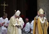 Benoît XVI n'a pas voulu décevoir les fidèles qui n'ont pas trouvé de place dans la Basilique Vaticane pour la célébration conclusive du Consistoire: plus de 20 mille au début, peut-être le double à la fin, malgré la pluie. Ainsi, au terme de la Messe, encore revêtu des parements liturgiques, il a rejoint le parvis et a guidé de là la prière de l'Angelus. "Je désire adresser mon cordial salut - a-t'il dit - à tous les présents, y compris ceux qui sont restés à l'extérieur de la Basilique. J'exprime une gratitude spéciale aux fidèles venus de loin pour accompagner les nouveaux Cardinaux et participer à cet évènement, qui manifeste de manière singulière l'unité et l'universalité de l'Église catholique. Aux distinguées autorités civiles je renouvelle ma pensée déférante. J'adresse finalement un cordial salut aux fidèles de langue italienne, venus nombreux malgré la pluie pour manifester leur affection et leur fidèle proximité aux six nouveaux Cardinaux italiens et à tous les néo-porporati ". "En une occasion comme celle-ci - a conclu Benoît XVI - on sent encore plus vivante la présence spirituelle de Marie très sainte. Comme dans le Cénacce de Jérusalem, elle est aujourd'hui au milieu de nous et elle nous accompagne dans cette étape du chemin ecclésial. A la Vierge nous voulons confier les nouveaux membres du Collège Cardinalice afin que chacun d'eux, comme tous les Ministres de l'Église, obtienne d'imiter toujours le Christ dans le service généreux de Dieu et de son Peuple, pour participer à sa glorieuse royauté".