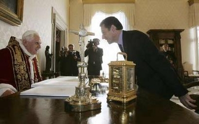 Je préfère ne pas trop m'attarder sur la composition de la délégation française. Le moins qu'on puisse dire est qu'elle manquait de chaleur, et surtout d'élégance, au propre comme au figuré. Show biz vulgaire (avec Bigard), et gauchiste repenti (avec Max Gallo, que j'apprécie ... un peu, mais pas à cet endroit). Les soi-disant nombreux catholiques du gouvernement (en particulier, Mme Boutin, empêtrée dans une sombre histoire concernant le logement de son directeur de cabinet) brillaient par leur absence. lLa vérité est que ces catholiques n'existent tout simplement pas! En regardant le direct sur KTO, j'ai vu qu'en attendant d'être introduit dans le bureau du pape, Nicolas Sarkozy avait même consulté sa montre. Ce qui est un comble, lorsqu'on a soi-même un quart d'heure de retard. Et on peut regretter que le président n'ait pas cru bon d'amener son plus jeune fils. C'était quand même une occasion spéciale, qui justifiait de manquer quelques cours... Il y aurait eu une dimension familiale et personnelle, qui faisait tristement défaut aujourd'hui. On avait l'impression d'un défilé de marrionnettes. ---------- Notons que le "faste" évoqué par le compte-rendu de Reuters n'est autre que le protocole parfaitement habituel lorsque le pape reçoit un chef d'état, ou de gouvernement...