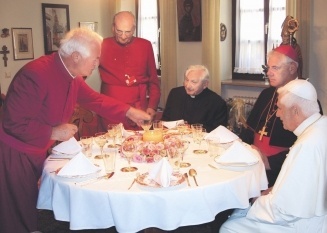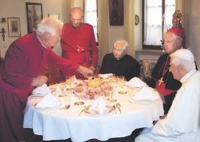Agnès Heindl est contente, elle a réussi à respecter son emploi du temps. Georg Ratzinger affirme que la préparation somptuaire du menu du Pape a constitué pour elle l'évènement de sa vie. Frau Heindl en a gardé le secret jusqu'au bout. Après avoir mûrement réfléchi, elle s'était mise calmement à l'ouvrage. Pour commencer, on sert l'apéritif, sur la terrasse du toit entourée de fleurs. L'ambiance s'y détend, devient joyeuse. Peu après, on passe dans la salle à manger, où le repas de midi va être servi. Le frère du Pape, l'évêque Gerard Ludwig Muller, les deux doyens des couvents, Heinrich Wagner et Hubert Schöner, l'ami de la famille Ratzinger, Thaddaüs Kühuel, et l'évêque kénian Mgr Kuvuva, sont tous assis avec le Pape autour de la table, où est servi le repas de fête. Il n'y a pas que le Pape, à l'apprécier, Georg Ratzinger en fait aussi l'éloge. C'est "comme avant", sauf que le cercle des convives s'est élargi. Une discussion animée portant sur des thèmes religieux, s'engage autour de la table. Mais il y a aussi des conversations sur la vie quotidienne, et des bons mots sont même échangés. Le temps passe trop vite.