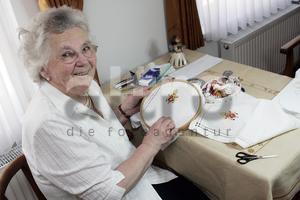 Frau Heindl brode les armories de Benoît sur les serviettes.