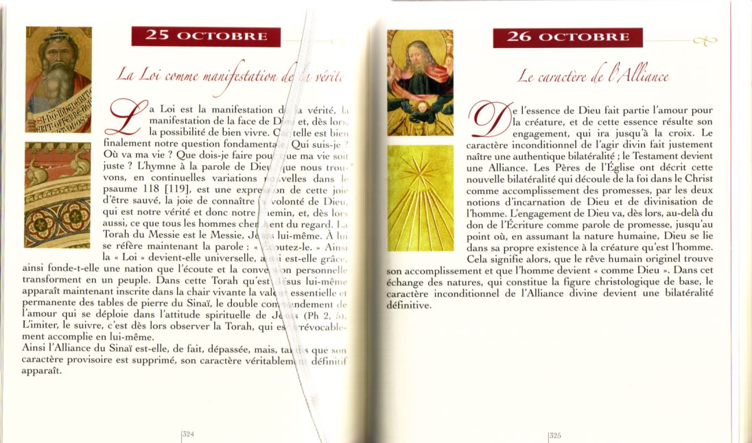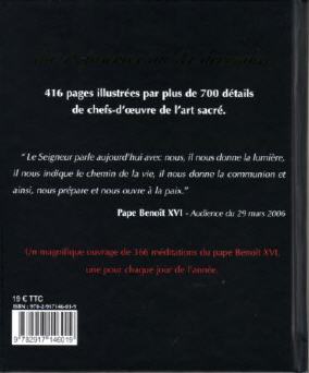 Vient de paraître, aux éditions "Magnificat": un livre magnifique, une très belle édition d'un prix modique, 366 méditations du Saint-Père, illustrées de détails de chef-d'oeuvre de l'art sacré. Ouvrage réalisé sous la direction de Peter John Cameron, O.P. (*) Voir ici: http://www.decitre.fr/livres/