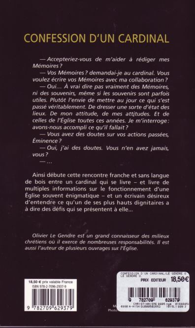 Le courageux cardinal qui, flattant le goût du mystère du lecteur "se livre - et livre de multiples informations sur le fonctionnement d'une église souvent énigmatique", au cours d'une "rencontre franche et sans langue de bois"(sic!) le fait... ANONYMEMENT. L'auteur, d'un bout à l'autre du livre, ne l'appelle que "mon cardinal". Cette circonstance ôte évidemment beaucoup de crédibilité à ses arguments, et une grande partie de sa force à son tir de barrage nourri - mais feutré, comme il se doit de la part d'un écclésiastique, c'est du moins ce que l'auteur semble croire- contre l'institution à laquelle il devrait en principe tout.