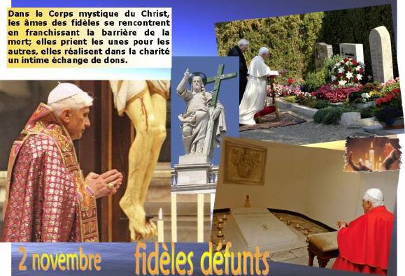 Ces images me touchent particulièrement, l'image du Saint-Père priant, avec son frère, sur la tombe de ses parents et de sa soeur est de celles qui ne s'oublient pas. Il me revient aussi en mémoire ce qu'avait écrit un des biographes de Joseph Ratzinger, Christian Feldmann, dans son livre, Der bayerische Papst, dont on peut lire des extraits traduits ici: http://www.benoit-et-moi.fr/archivesbeatriceweb/baviere/ ---------- "[..] chaque dimanche, à une heure de l'après-midi... les trois Ratzinger... se dirigeaient vers l'église de Ziegestdorf pour y prier tous les trois, tout d'abord dans l'église, puis dehors, dans le cimetière, devant la tombe des parents que Joseph Ratzinger avait fait transférer depuis Traunstein. Dans cette communauté des vivants et des morts, la famille, chaque dimanche, se retrouvait ensemble à la limite de la plénitude, comme cela ne peut être compris que par des chrétiens."