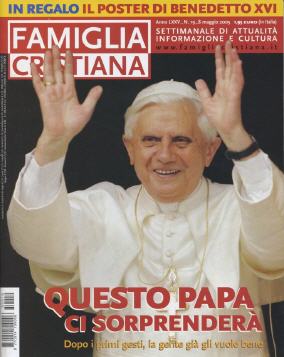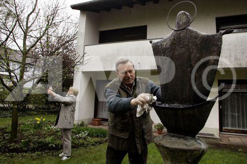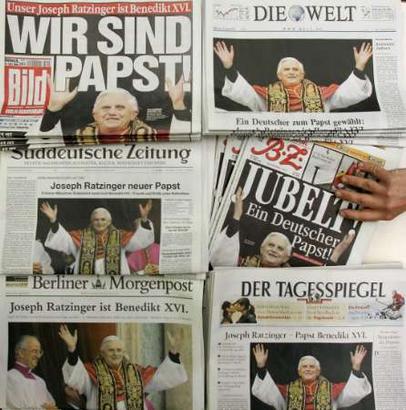 Sheelagh m'a envoyée une série de photos sur le 19 avril 2005, la plupart m'étaient connues, mais pas toutes. Comme ce profil souriant et ému... et ces petites manches noires désormais mythiques. Cette image du drapeau français, Place Saint-Pierre, et celle de Rupert Hofbauer dans le jardin de la maison de Pentling, polissant la fameuse statue de bronze de Christian Stadler représentant la Sainte-Vierge abritant sous son manteau trois humains qui pourraient représenter Maria, Georg et Joseph Ratzinger. Et les coupures de journaux