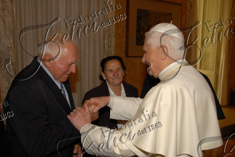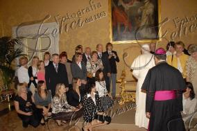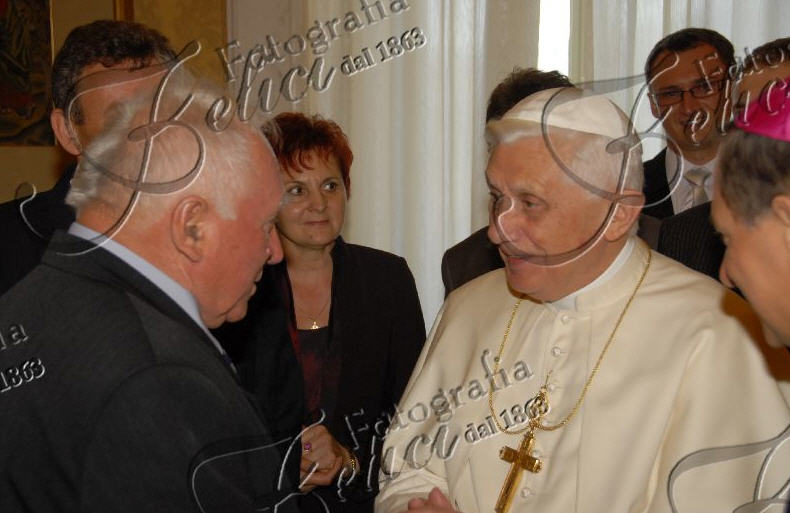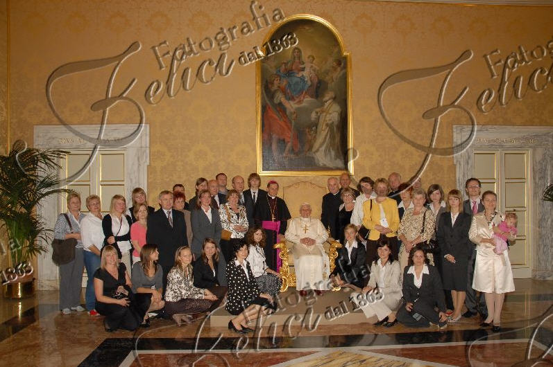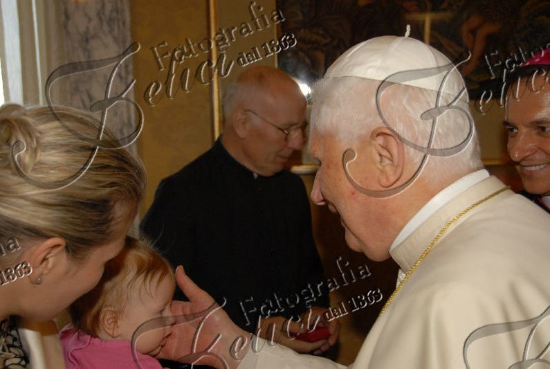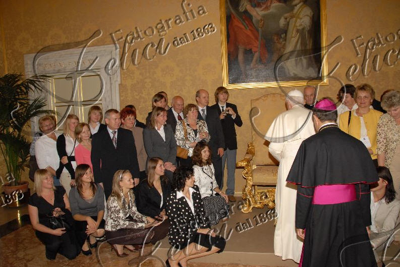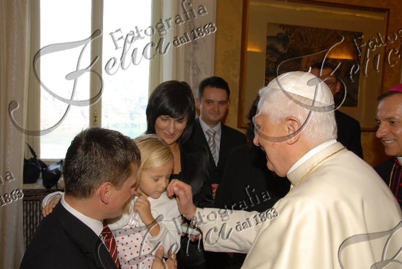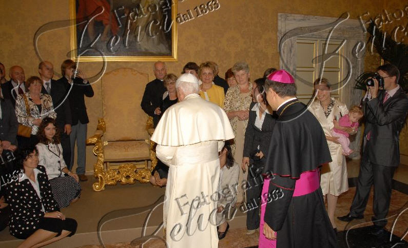 Décidément, l'agence FOTOGRAFIA FELICI réalise, discrètement et à l'écart des grandes agences de presse, les plus formidables des reportages. Par exemple, cette série de photos non légendées, nous permet de vivre une belle fête de famille, presque comme si on y était. Cela se passe juste après l'Angelus du 30 septembre, à Castelgandolfo. La veille, "Don Mietek" a reçu l'ordination épiscopale des mains du Saint-Père. Là, on devine que sa nombreuse famille a été reçue en audience privée au palais Apostolique, par le Pape. Il faut observer attentivement les expressions, les gestes, les attitudes. L'émotion profonde des parents, la gentillesse affectueuse du Saint-Père, le sourire du jeune évêque. Une vraie fête de la joie partagée, sans protocole, dans la simplicité et la cordialité.. Il est très facile d'imaginer les dialogues qui se sont échangés, jusqu'à la photo de groupe finale, dans un joyeux désordre guère protocolaire...