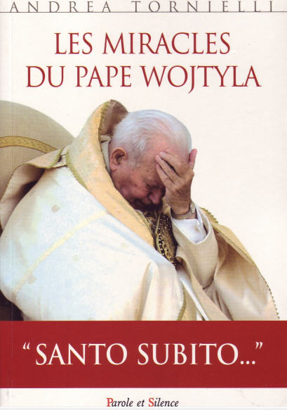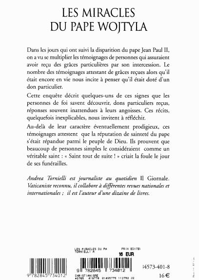 Voici ce que dit la quatrème de couverture: ------------------------- LES MIRACLES DU PAPE WOJTYLA Dans les jours qui ont suivi la disparition du pape Jean Paul II, on a vu se multiplier les témoignages de personnes qui assuraient avoir reçu des grâces particulières par son intercession. Le nombre des témoignages attestant de grâces reçues alors qu'il était encore en vie nous incite à penser qu'il était doté d'un don particulier. Cette enquête décrit quelques-uns de ces signes que les personnes de foi savent découvrir, dons particuliers reçus, réponses souvent inattendues à leurs angoisses. Ces récits, quelquefois inexplicables, nous invitent à réfléchir. Au-delà de leur caractère éventuellement prodigieux, ces témoignages attestent que la réputation de sainteté du pape s'était répandue parmi le peuple de Dieu. Ils prouvent que beaucoup de personnes simples le considéraient comme un véritable saint : « Saint tout de suite ! » criait la foule le jour de ses funérailles.