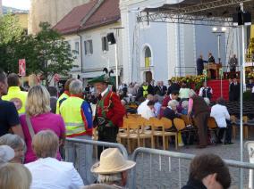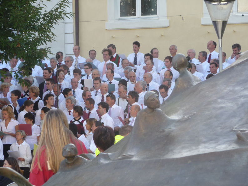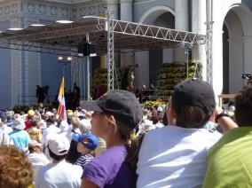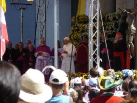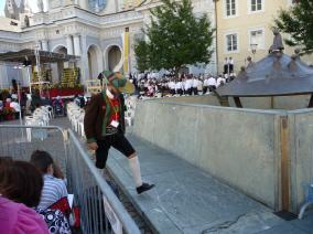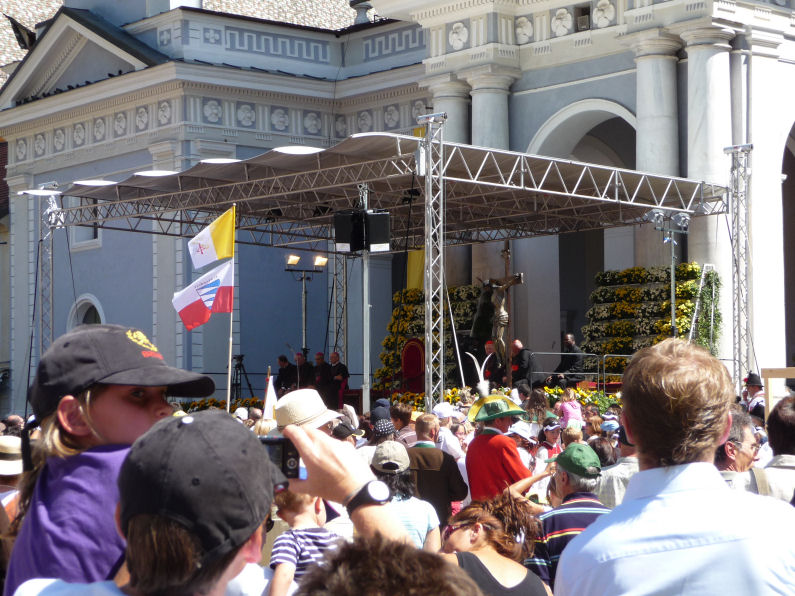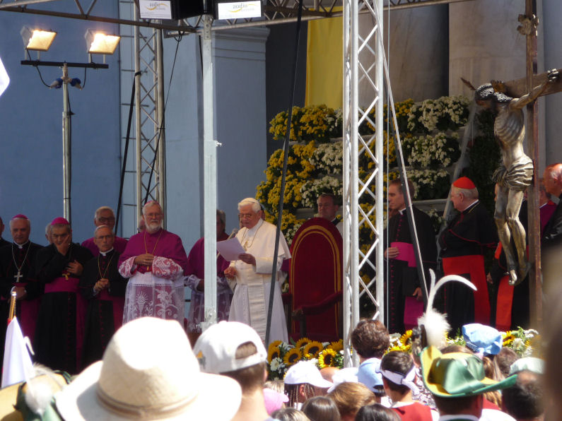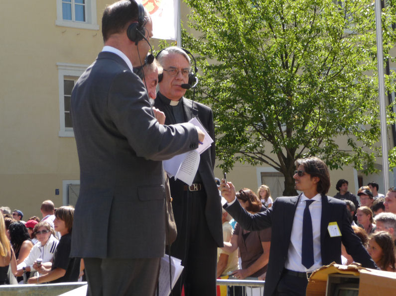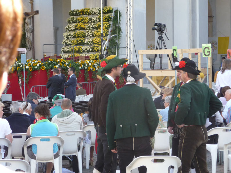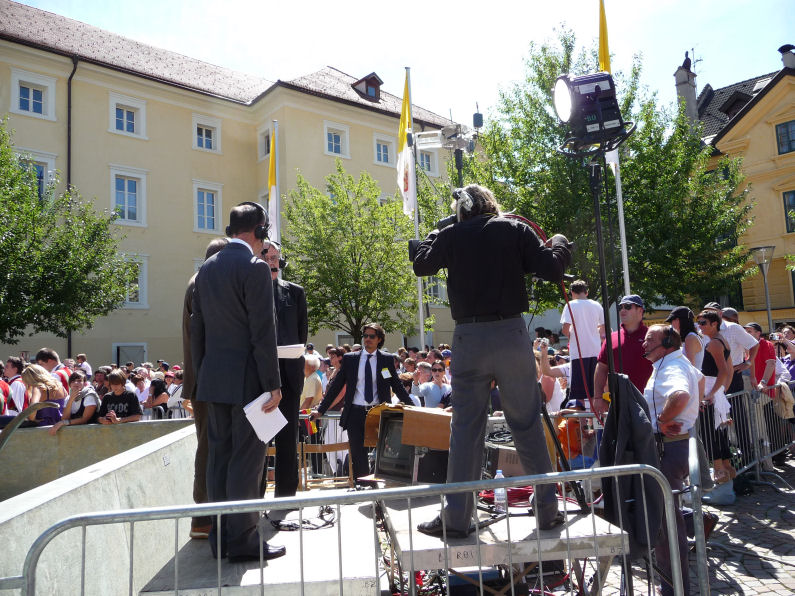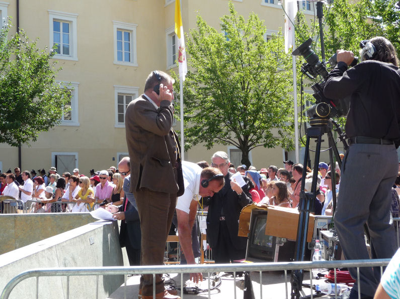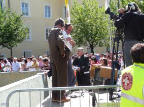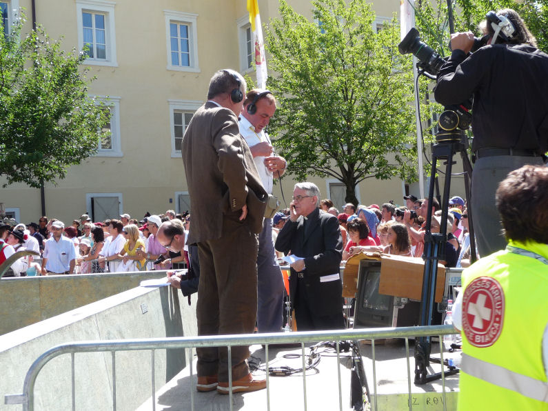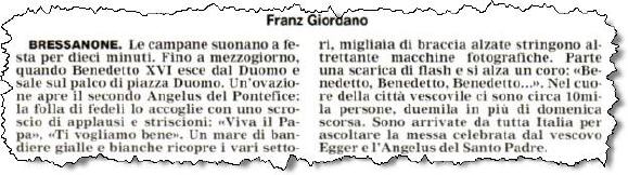 (Franz Giordano, 11/8/20078) Les cloches sonnent à la volée pendant dix minutes. Jusqu'à midi, quand Benoît XVI sort du Dôme et monte sur le podium. Une ovation ouvre le second Angelus du Pontife: la foule des fidèles l'accueille avec une explosion d'applaudissemnts et de banderoles: "Viva il Papa", "Ti vogliamo bene" (nous t'aimons). Une marée de bannières jaunes et blanches recouvrent les différents secteurs, des milliers de bras levés tiennent autant d'appareils photos. Une salve de flashes part, et un choeur s'élève: "Benedetto, Benedetto, Benedetto...". Au coeur de la cité épiscopale, il y a environ 10.000 personnes, 2.000 de plus que dimanche dernier. Ils sont venus de toute l'Italie pour écouter la Messe célébrée par l'évêque Egger, et l'Angelus du Saint-Père.