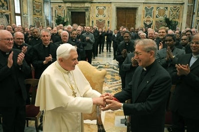 Rappel à l'ordre ------------- "Alors que vous vous efforcez de construire des ponts de compréhension et de dialogue avec ceux qui n’appartiennent pas à l’Eglise -a ajouté le Pape- ou qui ont des difficultés à en accepter les positions ou les messages, vous devez en même temps loyalement prendre en charge le devoir fondamental de l’Eglise de rester fidèle à son mandat d’adhérer totalement à la Parole de Dieu, et le devoir du Magistère de conserver la vérité et l’unité de la doctrine catholique dans son entier". Il a ensuite souligné que "cela ne vaut pas seulement pour l’engagement personnel des seuls Jésuites: puisque vous travaillez comme membre d’un corps apostolique -a-t-il dit- vous devez toujours être attentifs à ce que vos oeuvres et institutions conservent toujours une identité claire et explicite, afin que votre activité apostolique ne reste pas ambiguë ou obscure, et pour que de nombreuses autres personnes puissent partager vos idéaux et s’unir à vous efficacement et avec enthousiasme en collaborant à votre engagement au service de Dieu et de l’homme".