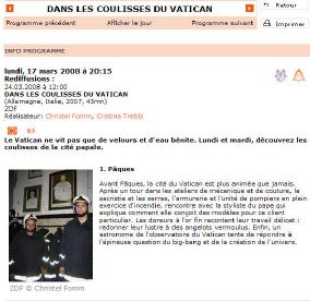 Michelle, qui habite en Allemagne, a eu la gentillesse de m'envoyer un exemplaire de la revue "Arte", qui publie chaque semaine les programmes de la chaîne. 2 pages annoncent les émissions consacrées au Vatican. Elles sont illustrées par une photo que je ne crois pas nécessaire de commenter! Cliquez sur la vignette.
