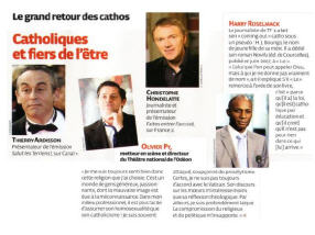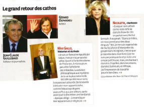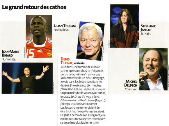 L'auteur de l'article se moque du monde. Si Thierry Ardisson, Gérard Depardieu, Roselyne Bachelot, Valérie Pécresse (citées à l'intérieur de l'article), Jean Marie Bigard, et les autres sont catholiques, alors moi, je me fais boudhiste illico. Sans avoir la prétention d'attribuer des brevets de catholicité, je sais ce que dit le Saint-Père, et le moins que l'on puisse dire, c'est que ces gens-là ne témoignent pas par leur vie (ni par leurs actes, en ce qui concerne ls politiques!). Ils sont peut-être catholiques et fiers de l'être... mais ils le cachent bien!