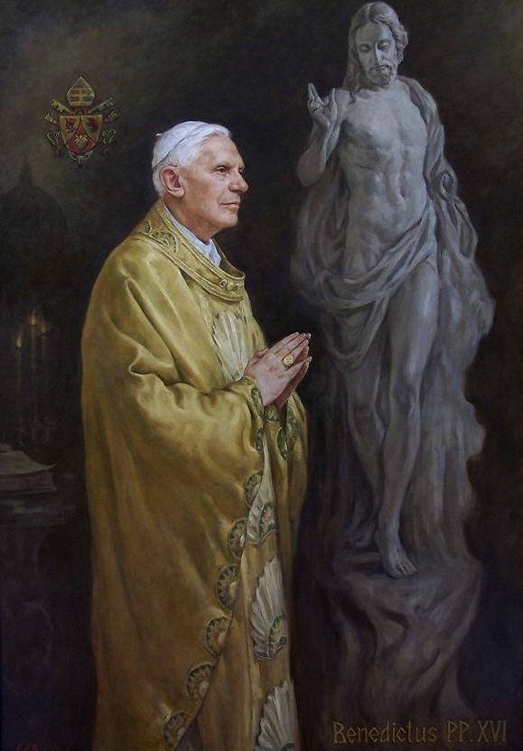 [..] le portrait, qui a été peint aux Etats-Unis,.. marquera l'occasion de la visite du pape pour un grand nombre de générations dans le futur. Par son style, il rejoint la tradition des grands artistes de la Renaissance. Il y parvient en saisissant avec amour les traits de l'être humain, depuis le feu calme dans les yeux du pape jusqu'à la description réaliste de ses doigts. À peine perceptible à l'arrière-plan, on devine le dôme de Michel-Ange, Place Saint-Pierre, un ciel légèrement plus lumineux autour de la chasuble de Benoît XVI, et, en-dessous, trois bougies allumées honorant la Sainte-Trinité et, reflété dans leur lumière, les pages du Missel avec les textes de la bible.