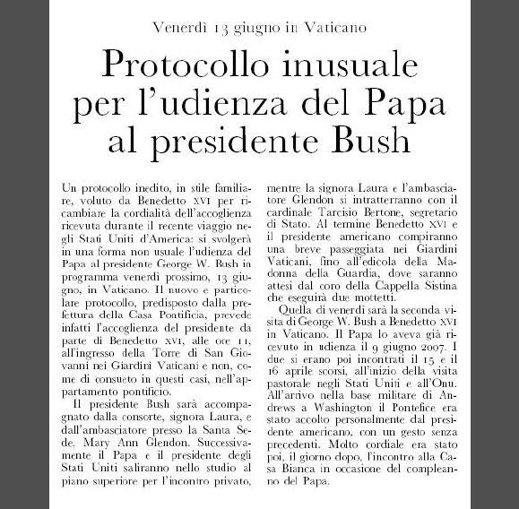 Vendredi 13 juin, le président américain recevra du Saint-Père un accueil "inhabituel". (10/6/2008)
