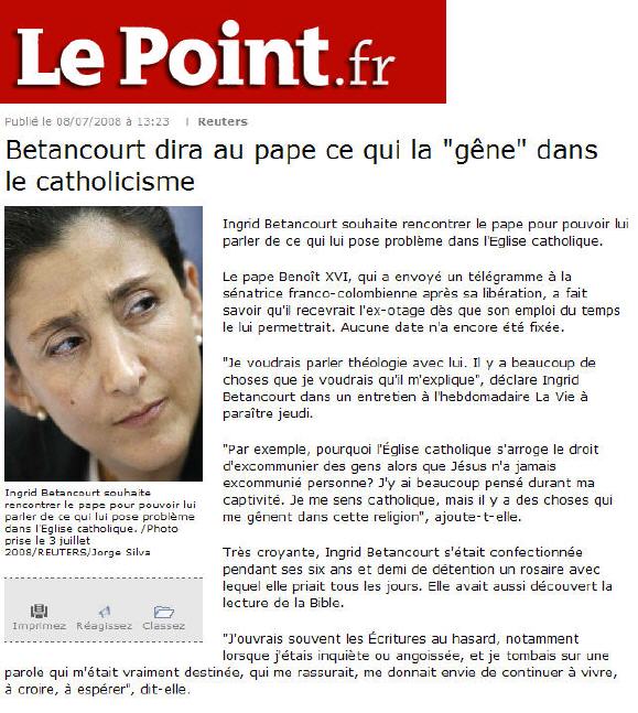 Je consulte régulièrement - et en traduis parfois des articles - ce blog très bien informé. A la suite d'un article sur un tout autre sujet, un lecteur interroge Paolo Rodari, lui demandant si, lors de l'angelus du 6, le Pape s'exprimerait sur la libération d'Ingrid Betancourt (c'était le 5 juillet, on sait depuis qu'il ne l'a pas fait). Réponse du journaliste: -------------- Je ne sais pas. Déjà dans la semaine (la veille de la libération) il s'était exprimé sur la Colombie. Il pourrait exprimer sa satisfaction. Plus curieux, par contre, ce qui est arrivé hier: la Betancourt a fait savoir qu'elle allait tout de suite se rendre chez le Pape. Au Vatican, personne n'était au courant... mais certainement qu'ils lui accorderont une audience bientôt. --------------- Autrement dit, ce n'e serait pas une invitation, mais presque une imposition...
