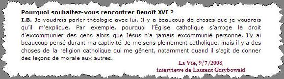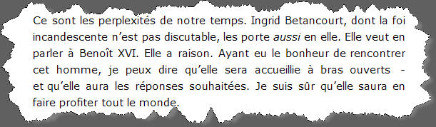 Ingrid Betancourt veut parler théologie avec le Pape. Ne voit-elle pas un peu grand? A moins que les medias n'aient déformé ses propos, c'est possible...