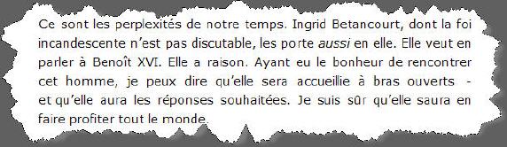 Pour rendre justice à la vérité, et en évitant de faire des commentaires - qui s'imposent d'eux-mêmes - voici finalement les propos de Madame Betancourt, tels qu'ils sont rapportés par l'hebdomadaire La Vie, qui a réalisé l'interviewe.