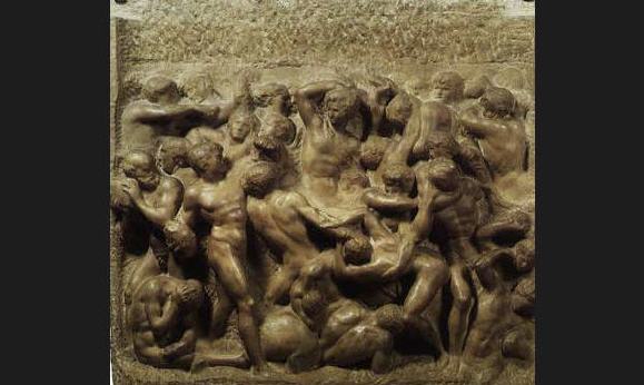J'inclus ce sujet tiré de la mythologie grecque parmi les oeuvres de l'"artiste théologien" pour des motifs évidents. L'orientation de sa vocation qu'un jeune sculpteur pouvait élaborer dans les annés quatre-vingt-dix du Quattrocento florentin, et dans le cercle laurentien, incluait nécessairement des connaissances du corps comme sujet dérivant de l'étude de l'art antique et, en même temps, des connaissances mythologiques ; c'est-à-dire qu'au-delà de la forme, il incluait le contenu de l'art gréco-romain. De telles connaissances de type classique n'étaient cependant pas brisées par la matrice chrétienne dominante de l'époque mais, au contraire, mises à son service : ainsi nous avons vu le pouvoir du Fils nouveau-né de Dieu dans le corps classiquement musculeux que Michel-Ange lui attribue dans la Madone de l'escalier, et ici, dans la Bataille des centaures, nous voyons probablement une moralisation chrétienne de l'évènement mythologique. Condivi rappelle, en effet, comment l'humaniste Angelo Poliziano, membre illustre du cercle laurentien où il remplissait les fonctions de précepteur des fils du Magnifique, afin d'aider le jeune Michel-Ange, lui expliquait le sens des sujets classiques comme l'enlèvement de Déjanire et la bataille des Centaures - "explications", qui (à la manière des humanistes du Quattrocento) devaient présenter le récit païen à la lumière de la morale judeo-chrétienne -. Ainsi la défaite des centaures, encore bestiaux dans leur corps et dans leur comportement, venant d'êtres humains assistés par un dieu (Apollon) était probablement interprétée en termes d'une graduelle évolution vers la plénitude de cette humanité qui - tout le monde le savait, il n'était même pas nécessaire de le dire - serait totalement assumée par le Fils de Dieu. Quelle que soit la teneur des explications de Poliziano, le fait est que - déjà dans l'adolescence de Buonarroti - la sculpture antique, le corps humain, les mythes gréco-romains et la tradition de la foi et de l'art chrétien ont conflué en un unique sens de la vocation ou de la mission du jeune homme, formant, avant même que Michel-Ange eût dix-sept ans, la vision culturelle personnelle avec laquelle il devait vivre par la suite. C'est précisément de cette confluence paradoxale et dynamique que devaient dépendre quelques-unes de ses inventions les plus révolutionnaire- des oeuvres comme le Tondo Doni