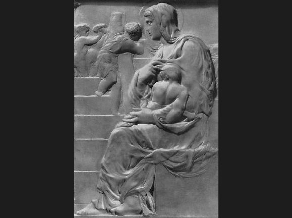 Laurent le Magnifique, et la tradition toscane --------------------- Michel-Ange sculpta ce relief alors qu'il était élève de l'Académie instituée par Laurent de Médicis, où il était arrivé à la suite d'un épisode significatif. Vasari dit que le Magnifique, " déplorant (...) qu'en son temps il ne se trouvât pas de sculpteurs illustres et prestigieux, alors qu'on trouvait des peintres de très grand talent et renommée, délibéra (...) de faire une école ; et pour cela, il demanda à Domenico Ghirlandaio que, si dans son atelier, il avait quelque jeune qui y eût de l'inclination , il l'envoyât au jardin afin de l'exercer à créer d'une manière qui l'honorerait lui et sa ville "(Vie de Domenico Ghirlandaio). Le "jardin" où Lorenzo de Medicis recevait les jeunes était près du couvent de Saint Marc, c'était là que les Medicis gardaient leur collection de sculptures antiques, avec Bertoldo de Giovanni comme "curateur". L'intention de l'invitation, qui amena Michel-Ange en même temps qu'un autre "jeune" de l'atelier de Ghirlandaio, Francesco Granacci, au jardin des Medicis, était par conséquent celle de former une future génération de sculpteurs sous la direction d'un disciple du plus grand sculpteur du XVe siècle, Donatello, à travers le contact direct avec une des sources principales de l'art donatellien, la sculpture gréco-romaine. Le tout dans le but de combler la lacune créée après la mort de Donatello, le manque de grands maîtres de la sculpture du marbre à Florence. Ainsi le sens d'un appel à perfectionner la tradition toscane en la ramenant à ses racines antiques, dont parle Vasari dans la "Vie de Michel-Ange", naît précisément dans le cadre du programme culturel de Laurent de Medicis pour sa ville, et les rappels donatelliens et antiques de la Madone de l'escalier correspondent aux attentes du généreux mécène. Et l'héroïcité de l'Enfant au sein de Marie, dans le relief, est peut-être une évocation de l'antique, mais dans une clé d'interprétation "alimentaire", qui invite l'hypothèse d'une identification personnelle et nationale : la toute nouvelle re-connaissance de l'Antiquité nourrie au sein maternel de la tradition florentine.