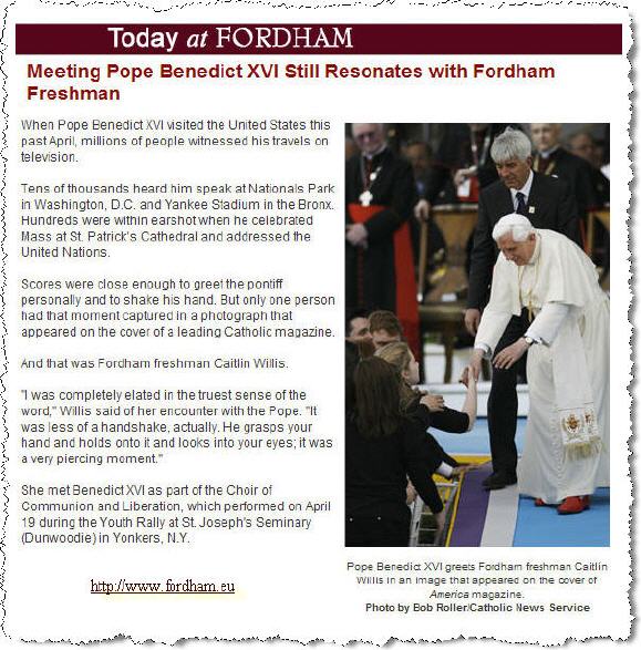 Article original: http://www.fordham.edu/... Meeting Pope Benedict XVI Still Resonates with Fordham Freshman Traduction ---------------------