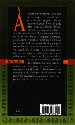 A travers une évocation poétique des lieux qui ont marqué l'existence de saint Augustin, depuis les montagnes d'Afrique du Nord jusqu'aux plaines d'Italie, cet itinéraire spirituel est l'occasion de découvrir les différentes étapes de sa vie et de son oeuvre. Thagaste, Carthage, Milan, Rome, Hippone... Le lecteur marche sur les pas de cet illustre enfant de l'Algérie pour revivre les émotions des moments forts de sa vie. Ces lieux, le visiteur n'a de cesse d'en tourner les pages, comme un livre où se mêlent les échos des voix d'Augustin et de sa mère, sainte Monique. Ponctué de citations des Confessions, rythmé par des aquarelles lumineuses, ce voyage sur les rives de la Méditerranée en compagnie du « docteur de la grâce » fait parler les paysages, les pierres et les arbres, pour réconcilier passé et présent.