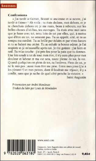 La quatrième de couverture reproduit la belle prière de Saint-Augustin, citée par le Saint-Père lors de la troisième catéchèse (7. Prière de Saint-Augustin ). Il peut être intéressant de comparer les deux traductions: ------------