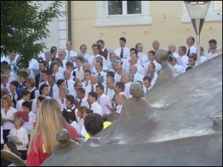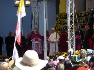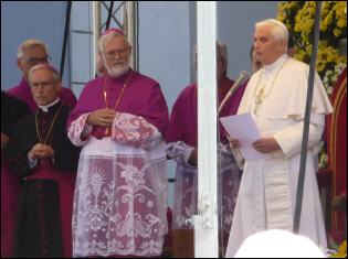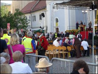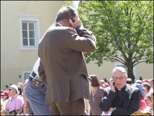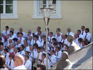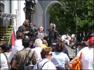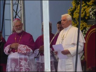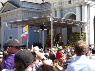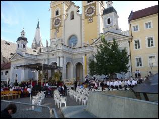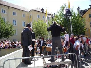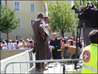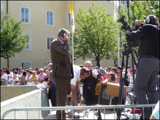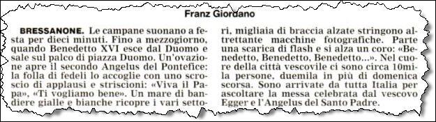 (Franz Giordano, 11/8/20078) Les cloches sonnent à la volée pendant dix minutes. Jusqu'à midi, quand Benoît XVI sort du Dôme et monte sur le podium. Une ovation ouvre le second Angelus du Pontife: la foule des fidèles l'accueille avec une explosion d'applaudissemnts et de banderoles: "Viva il Papa", "Ti vogliamo bene" (nous t'aimons). Une marée de bannières jaunes et blanches recouvrent les différents secteurs, des milliers de bras levés tiennent autant d'appareils photos. Une salve de flashes part, et un choeur s'élève: "Benedetto, Benedetto, Benedetto...". Au coeur de la cité épiscopale, il y a environ 10.000 personnes, 2.000 de plus que dimanche dernier. Ils sont venus de toute l'Italie pour écouter la Messe célébrée par l'évêque Egger, et l'Angelus du Saint-Père.