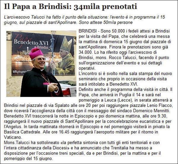 - Dimanche 15 juin, le Pape rencontrera à 9 h 15' les bénédictines et carmélites du diocèse dans la chapelle de l'évêché de Brindisi - A 10 h, il célèbrera la messe sur le quai Saint Apollinaire du port. - Après l'angélus, il retournera à l'évêché où il déjeunera avec les évêques de la région des Pouilles. - A 16 h 45', il rencontrera les prêtres en la cathédrale.