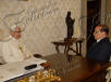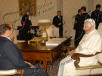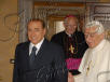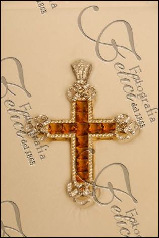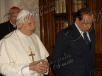 [..] Arrive le moment de l'échange des cadeaux. Berlusconi a fait réaliser une croix pectorale en or inscrustée de topazes et diamants, contenant différentes symbologies: le nombre des pierres est égal à celui des apôtres, les topazes sont des pierres "considérées par Clément V comme porteuses de santé (salute) et de guérison". "C'est un modèle unique, que nous avons fait réaliser en pensant à vous", dit le Cavaliere. Puis il tire de son enveloppe un feuillet avec l'explication détaillée du joyau. "Quand vous aurez un instant, vous pourrez le lire, chaque chose a une signification...". Ratzinger offre en échange au Président du Conseil une grande gravure du XVIème siècle représentant la Basilique Saint-Pierre, et un stylo artistique d'une série limitée produite pour les 500 ans de cette Basilique. Avant de quitter la bibliothèque, encore en présence de Benoît XVI, Berlusconi encourage ses collaborateurs: "A présent, vous devez travailler davantage, avec encore plus de passion et d'enthousiasme..."