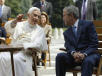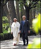 Tout de suite après a eu lieu une brève promenade dans le Jardin, pendant laquelle Bush a demandé quelle était la taille de la Cité du Vatican et à la réponse du préfet Harvey "c'est plus petit que le Texas", il a répliqué "mais c'est beaucoup plus important". Le Pape et le président ont parcouru les bastions de san Giovanni jusqu'à la hutte chinoise, où se trouve la grande cloche du jubilée de 2000. Ils ont ensuite poursuivi le long de l'allée Pie XI, jusqu'à la place de la Grotte de Lourdes, où dans une atmosphère très familiale, ils ont attendu, assis, la first lady et le cardinal secrétaire d'État. À leur arrivée les chanteurs de la Chapelle Sixtine, dirigés par le maestro Giuseppe Liberto, ont exécuté deux motets : "Exultate Deo" de Pierluigi de Palestrina et "Alma Redemptoris Mater" de Mgr Liberto lui-même. Après le second chant, le Pontife a présenté à Bush le maestro de la chapelle musicale pontificale. Le président a aussi serré les mains des pueri cantores, auxquels il a demandé s'ils allaient à l’école au Vatican. Avec un des plus petits d'entre eux, il a même échangé le typique salut à main ouverte qui, venu d'Amérique, s'est répandu dans le monde entier surtout parmi les jeunes. "Sainteté, nous sommes entourés de femmes de valeur", a commenté Bush pendant qu'était prise la photo souvenir de l'événement, avec l'épouse Laura et l'ambassadeur Glendon. A la fin, vers 12 heures 15, le président américain et sa suite ont pris congé du Pape, qui, avant de rentrer au Palais apostolique, a voulu saluer lui aussi les jeunes chanteurs de la Sixtine.