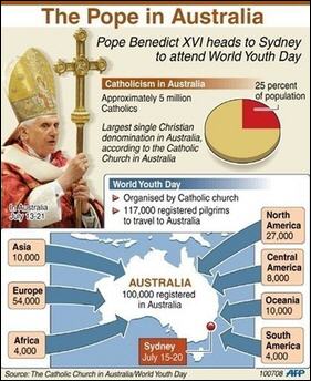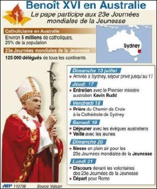 Papa Ratzinger est attendu dans un Pays grand comme le double de l'Europe, mais habité par moins de vingt et un millions de personnes, parmi lesquelles plus du quart (5.700.000) sont catholique. Le portait-robot de la réalité australienne photagraphiée par l'annuaire statistique de l'Église au 31 décembre 2006, montre une communauté catholique vivante et dynamique qui reflète l'esprit d'un Pays multiculturel, cosmopolite et ouvert à l'accueil, dans lequel le quart des habitants est né hors des frontières nationales, dans deux cents Pays différents. En Australie 80% de la population se professe chrétienne, surtout anglicane, mais les catholiques représentent le groupe le plus nombreux: en effet 27.56% se reconnaissent en communion avec le Pontife Romain.
