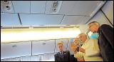 À bord, la délégation papale compte 27 personnes, parmi lesquelles le «premier ministre» du Saint-Siège, le secrétaire d'État Mgr Tarcisio Bertone, le maître des cérémonies liturgiques, Mgr Guido Marini, le directeur de la Salle de presse du Vatican (le «porte-parole»), le jésuite Federico Lombardi, et le secrétaire particulier du Pape, Mgr Georg Gaenswein. Quatre gendarmes et deux gardes suisses assurent la sécurité rapprochée de Benoît XVI qui est également accompagné de deux médecins. Quarante-quatre journalistes (dont quatre Français) ont pris place à l'arrière de l'appareil. À l'avant, dans un espace spécialement aménagé, le Pape, âgé de 81 ans, dispose d'un lit pour se reposer.