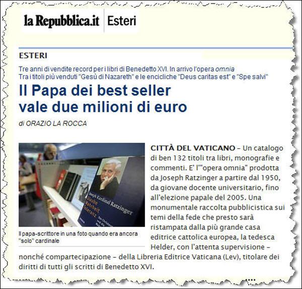 Si c'est la Repubblica qui le dit... c'est un vrai compliment! On peut regretter qu'ils voient le fric (comment dire autrement?) partout. Mais la Repubblica n'est pas... vraiment un journal religieux, et leur réaction ne peut pas surprendre. Dans la logique de profit qui est malheureusement celle de notre monde, l'information contient certainement plus d'admiration que de malice, puisqu'IL les bat même sur le terrain qui est le leur!!