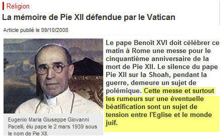 Associées à un long article en défense de Pie XII écrit par le secrétaire d'état Tarcisio cardinal Bertone, et publié plus tôt cette semaine par L'Osservatore Romano, le journal officiel du Vatican, les remarques de Benoît, ce matin, semblent l'indication la plus claire possible que la cause pour déclarer la sainteté de Pie XII est en bonne voie.