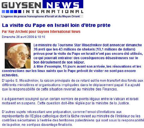 Côté israélien, où l'on s'apprête à dérouler le tapis rouge, cette visite ne fait pas oublier la polémique soulevée par la levée de l'excommunication de Mgr Richard Williamson, un évêque intégriste qui a nié la Shoah, ni la volonté de Benoît XVI de béatifier Pie XII.