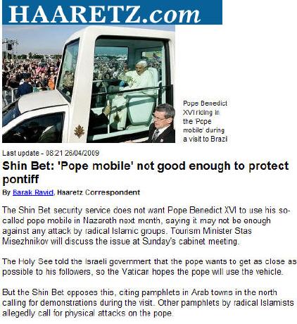 De son côté, le Shin Bet, responsable de la sécurité intérieure du pays a de son côté exprimé ses réticences quant à l’utilisation de la papamobile lors de son déplacement à Nazareth estimant que les conditions de sécurité n’étaient réunies pour éviter une attaque d’un groupe islamiste.