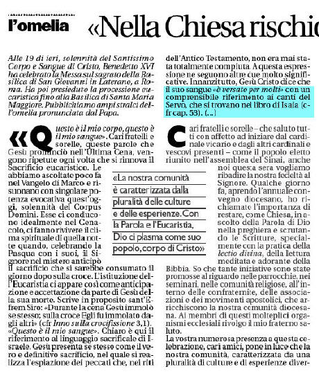 Un paragraphe important de l'homélie prononcée par le Saint-Père lors de la Messe de la Fête-Dieu a été caviardé par le quotidien de la CEI, L'Avvenire, et ignoré par les différentes "synthèses" officielles. A t'on craint qu'il soit mal interprété? (12/6/2009)