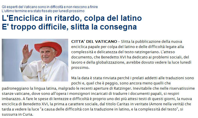 Il y en a qui déplorent, outre-Tibre (Oltretevere), que l'idiome de Cicéron soit devenu très difficile parmi les prélats tout en étant toujours la langue officielle de l'Église catholique et celle de prédilection du Pape : deux ans sont passés depuis que Ratzinger l'a relancée avec le Motu Proprio qui libéralisait la Messe pré conciliaire en latin, très chère aux lefrebvristes et traditionalistes [ndt: on se demande vraiment quel rapport il peut y avoir entre les intégristes et le retard dans la publication de l'encyclique; mais la présence de cette réflexion renseigne sur l'intention de l'auteur].