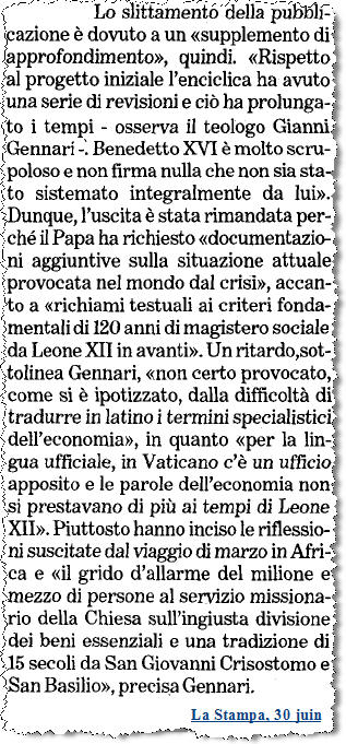 Lisant hier le blog (toujours excellent, et remarquablement informé) de Paolo Rodari, je trouve un assez long billet, <Enciclica. La crisi c’è e si combatte con la carità e la verità> (La crise est bien là et elle se combat avec la charité et la vérité). Suit une anticipation assez détaillée de ladite encyclique, que le Saint-Père avait d'ailleurs présentée lui-même le 13 juin dernier, devant les participants du Congrés de la Fondation Centesimus Annus Pro Pontifice (Le Pape présente la prochaine encyclique ), et qu'il a annoncée personnellement hier lors de l'Angelus (Solennité des Saints Pierre et Paul ).