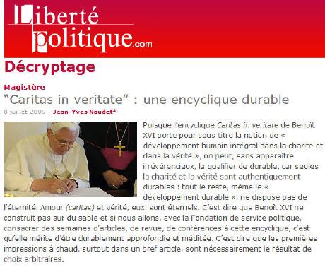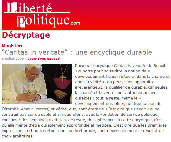 Et, surtout, le site Liberté politique, sur lequel il faudra revenir, et dont je me réjouis de signaler la première analyse, sous le titre en forme de clin d'oeil: une encyclique durable!