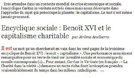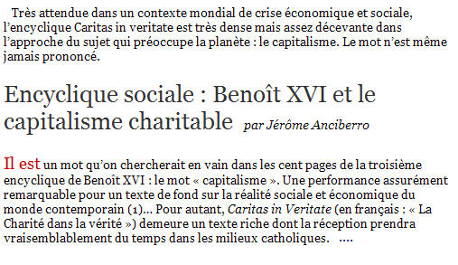 Dans ce document de 140 pages qui s'adresse aux évêques, Benoît XVI n'en reste pas à un registre papal classique - comme lorsqu'il proclame qu'un "humanisme sans Dieu est inhumain" ou qu'il espère faire de l'économie "un lieu de communion" -, il administre à ce capitalisme, maintes fois vilipendé par ses prédécesseurs, une leçon d'éthique sociale. L'évêque de Rome reconnaît des vertus à la mondialisation, dès lors qu'elle favorise le développement ou une meilleure répartition des richesses, mais il pointe surtout ses dysfonctionnements : les désordres de l'activité financière, la spéculation, la mauvaise gestion des flux migratoires, la corruption, l'exploitation anarchique des ressources naturelles, les délocalisations, le chômage, la faim, etc.